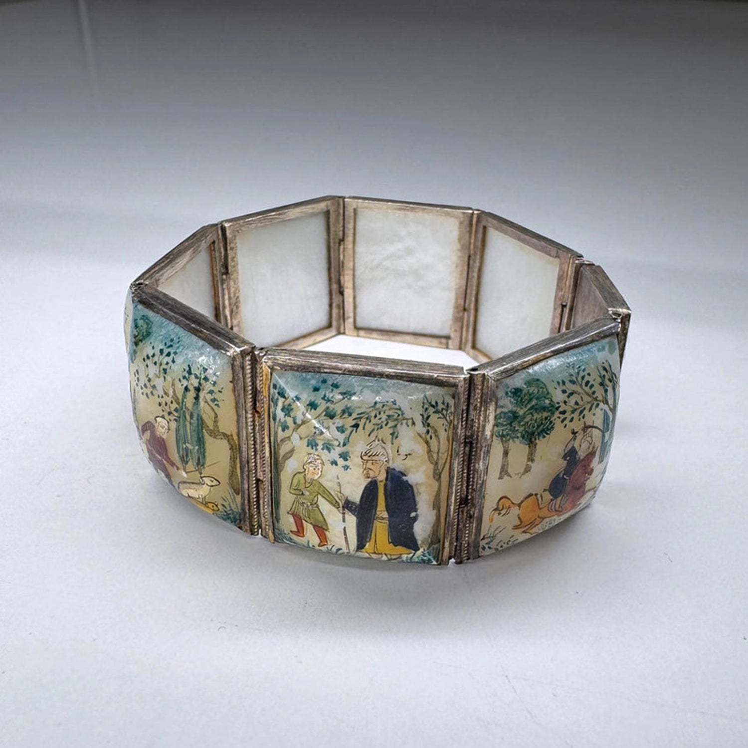 Vintage hinged hand-painted mother-of-pearl bracelet