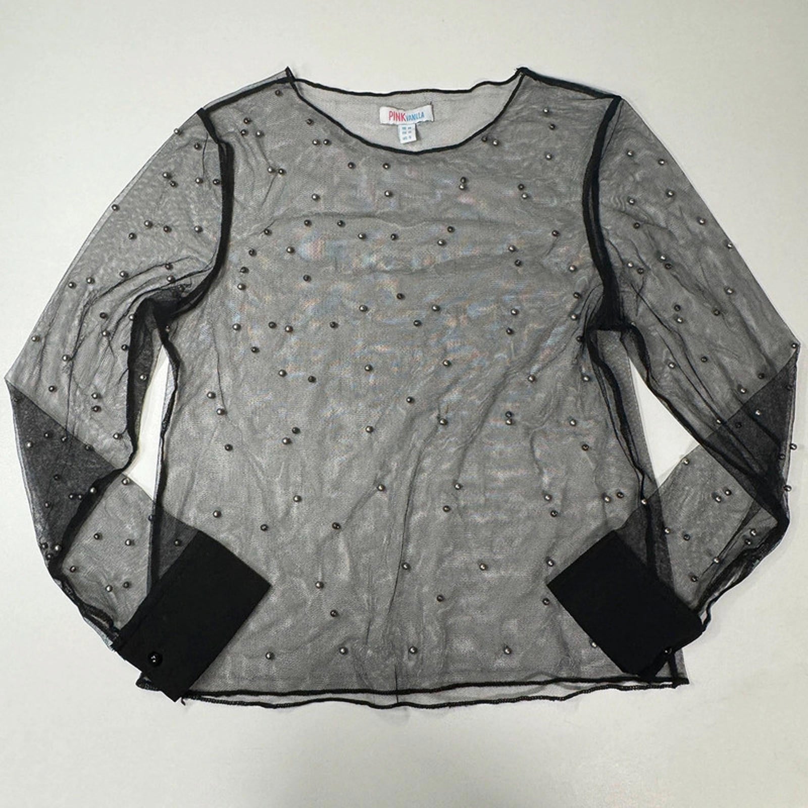 Pink Vanilla black sheer mesh long-sleeved top with small metallic beads. Contrasting solid black cuffs.