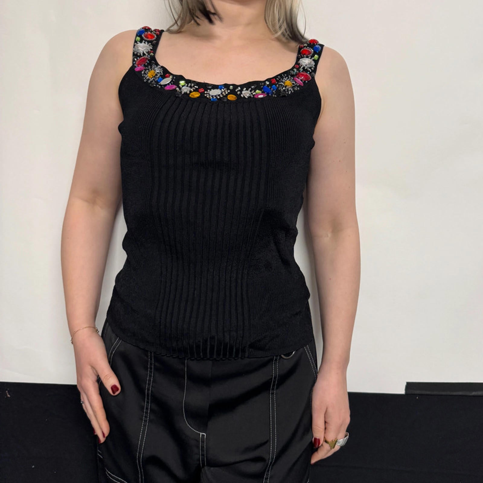 Vintage black sleeveless round neck top with colorful embellishments around the neckline. Can wear the straps as a vest or bardot style, lower on the shoulders. Brand: Caché, no tag on this one but it has floated up online previously - DM for screenshots if needed. Composition: 71% Rayon. 27% Nylon, 2% Spandex.