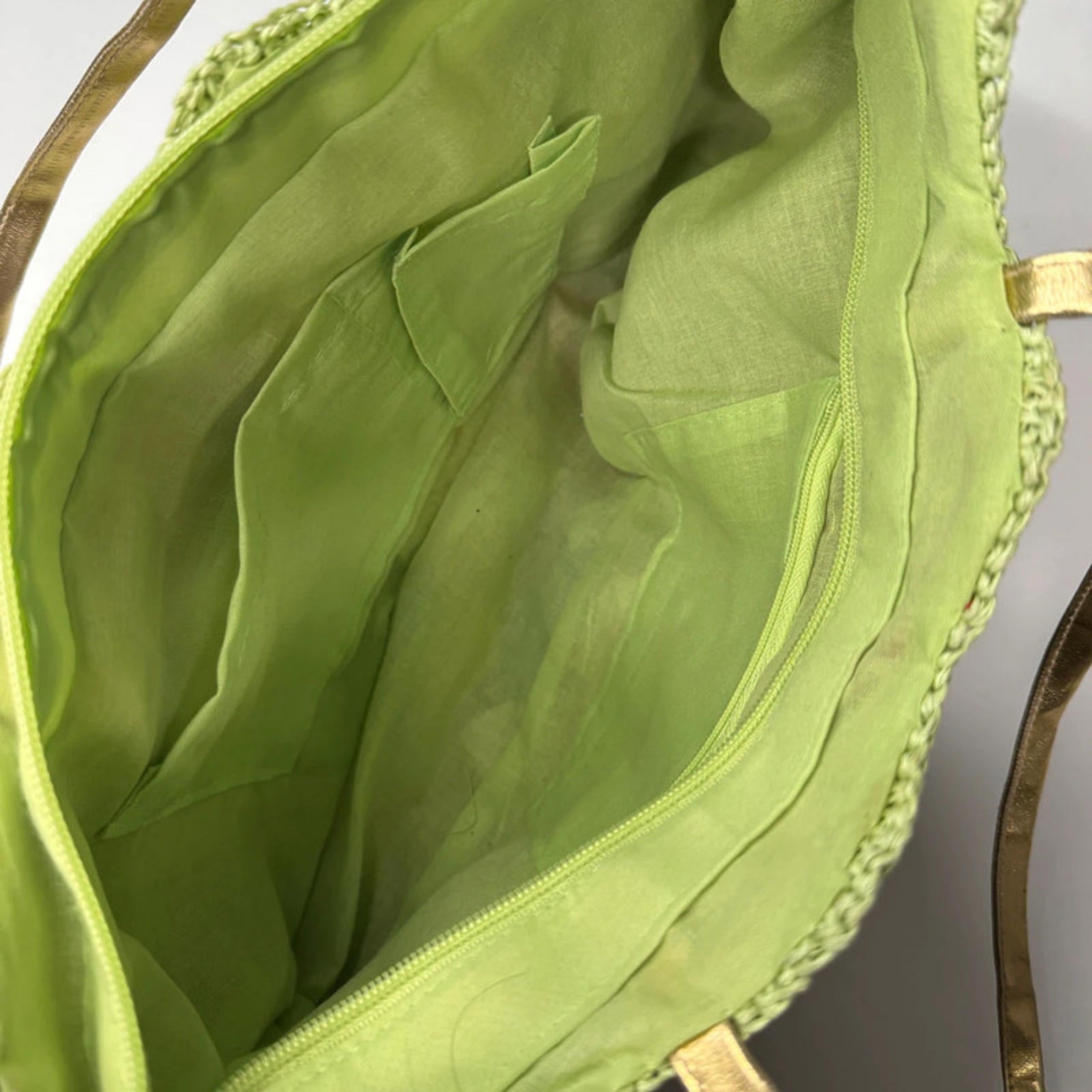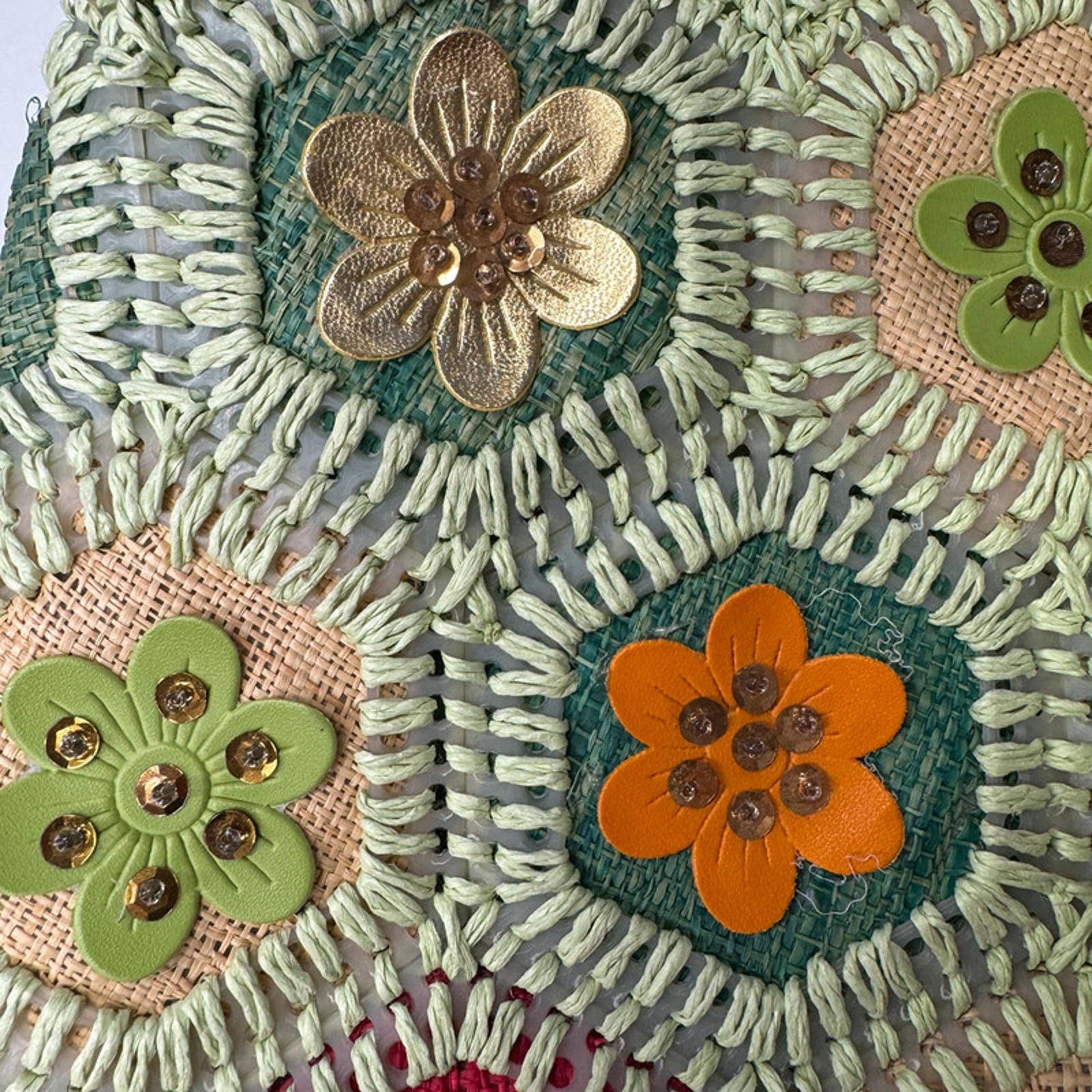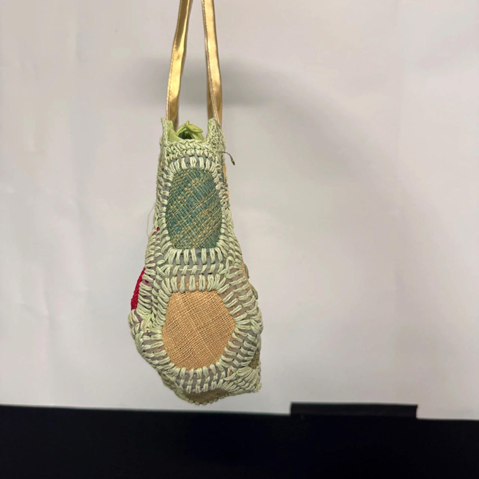 Vintage green floral woven raffia bag with gold handles and scalloped top edge. Extremely cute & spring-like!