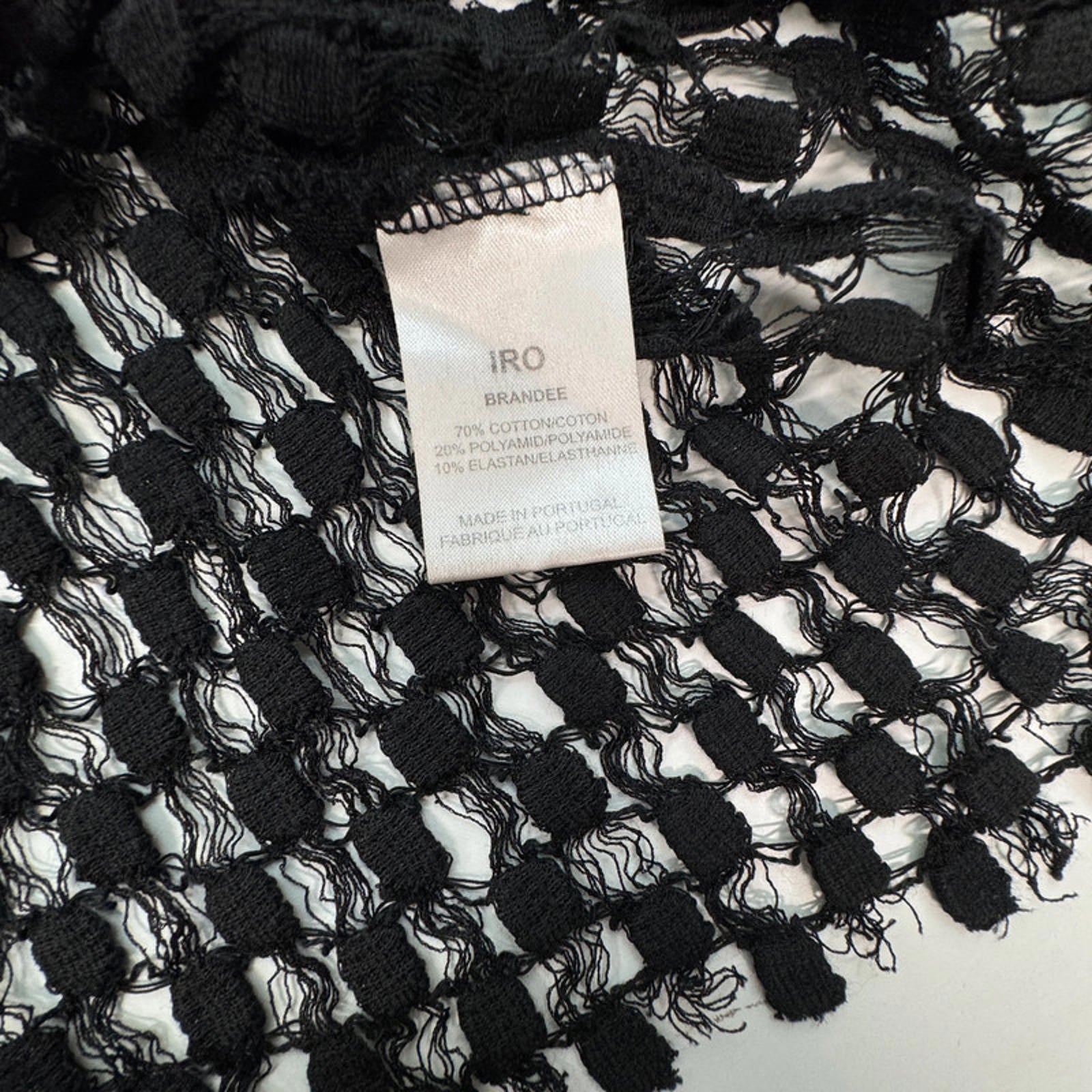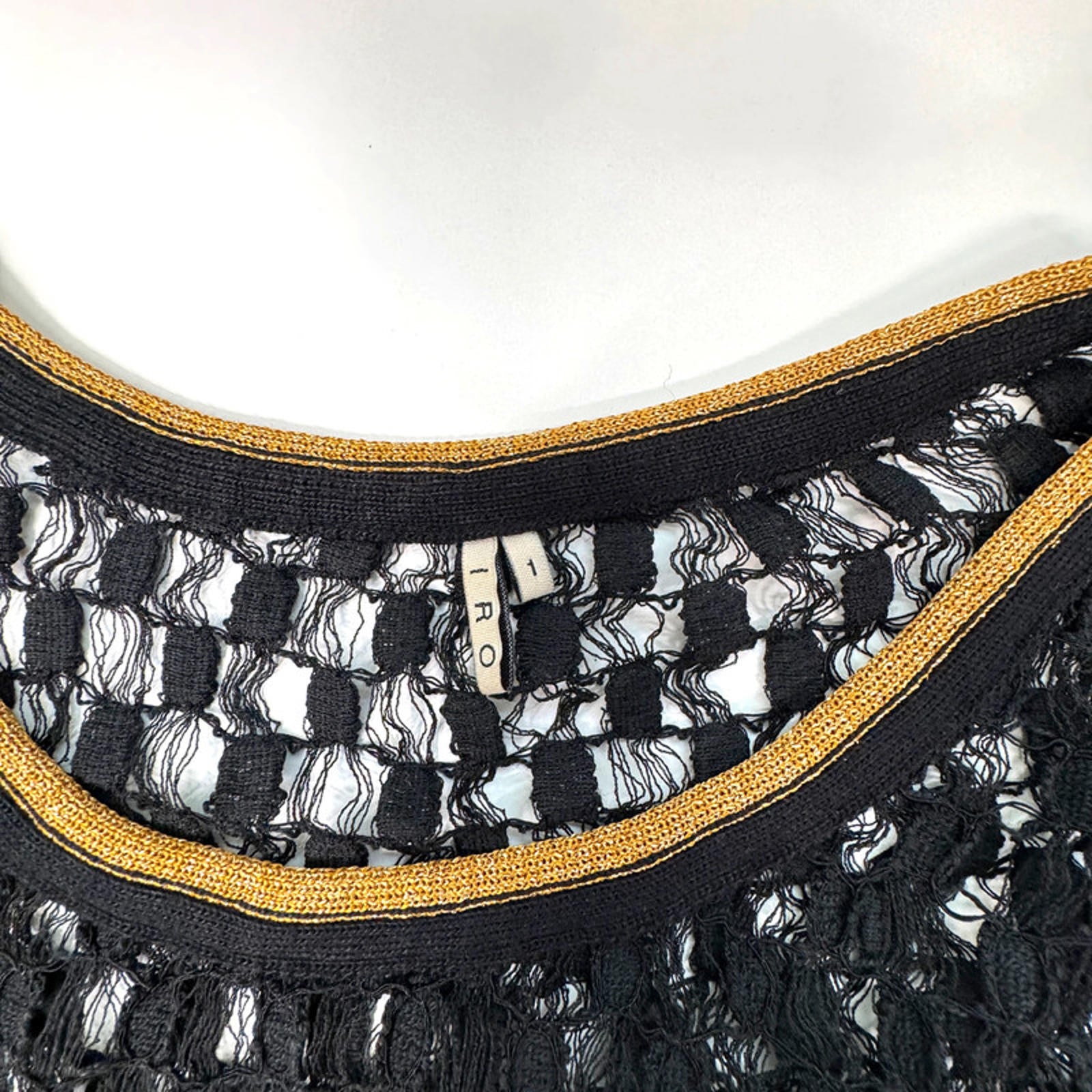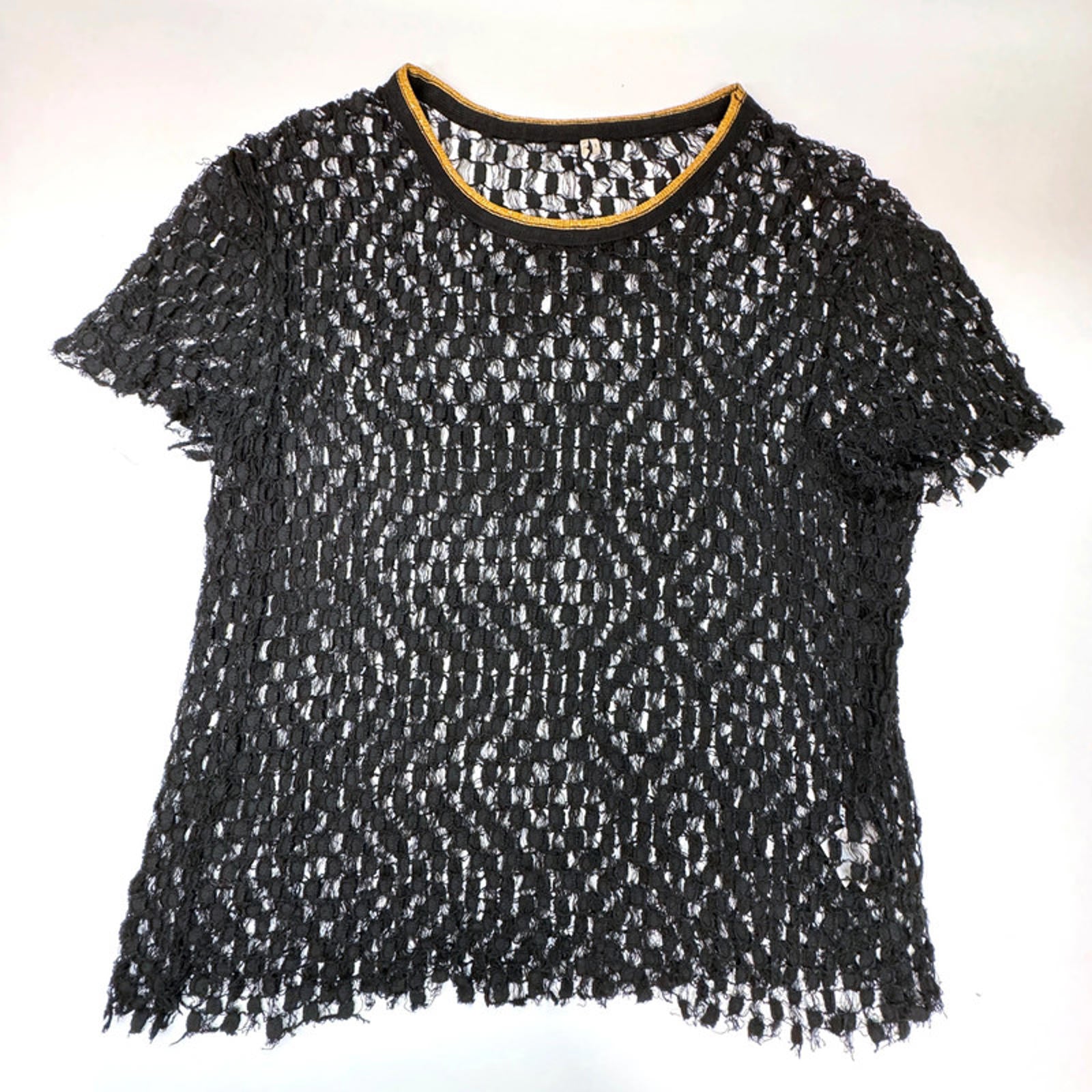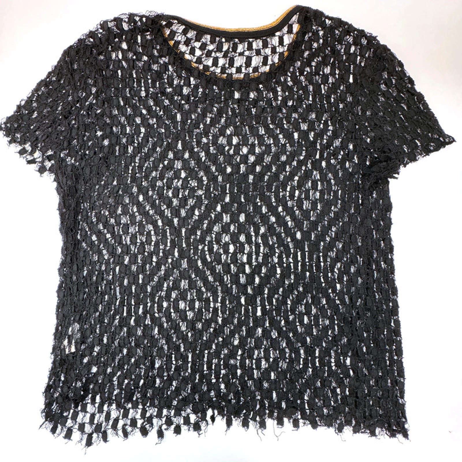 Iro black short-sleeved top with a textured open-knit design. Round metallic yarn neckline.