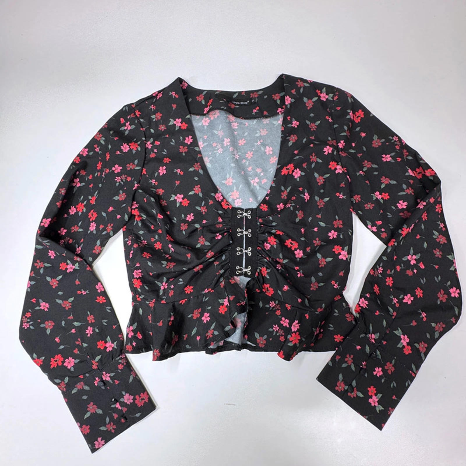 Linjia Shop black long sleeve top with red floral print, ruched front, peplum hem and hook-eye closures. Extra summery.