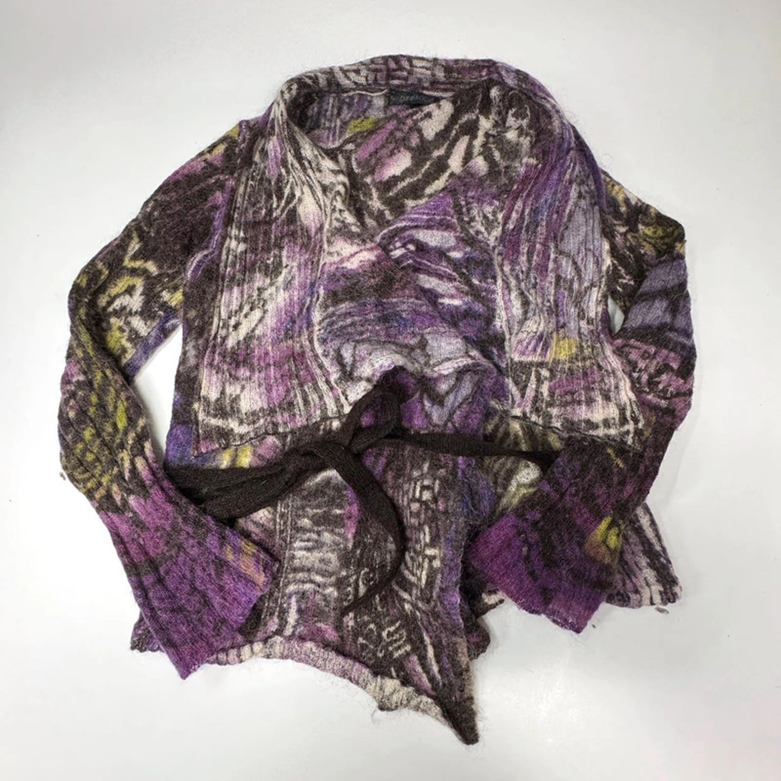 Passport purple and green wool wrap cardigan with waterfall collar and tie waist. Amazing pattern.
