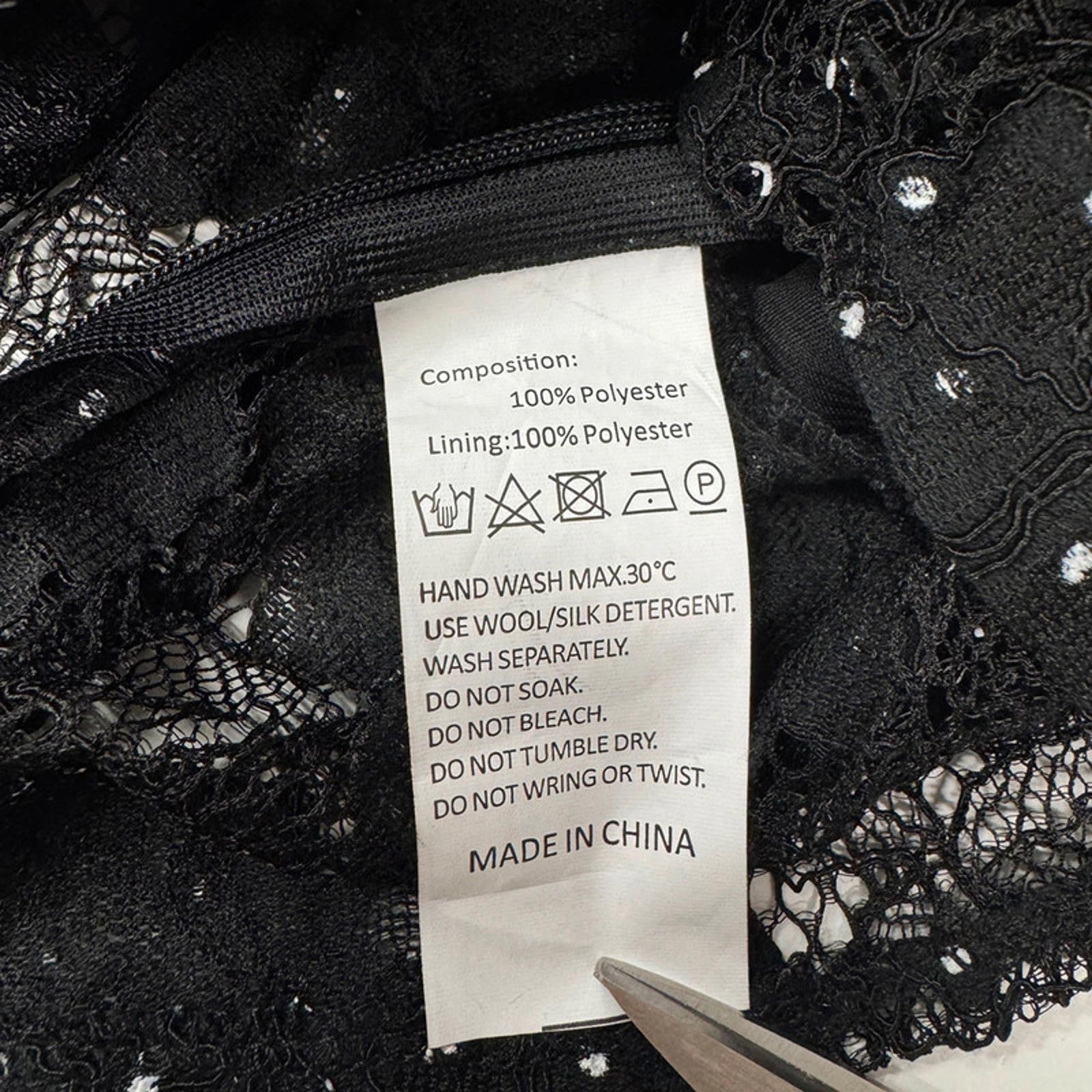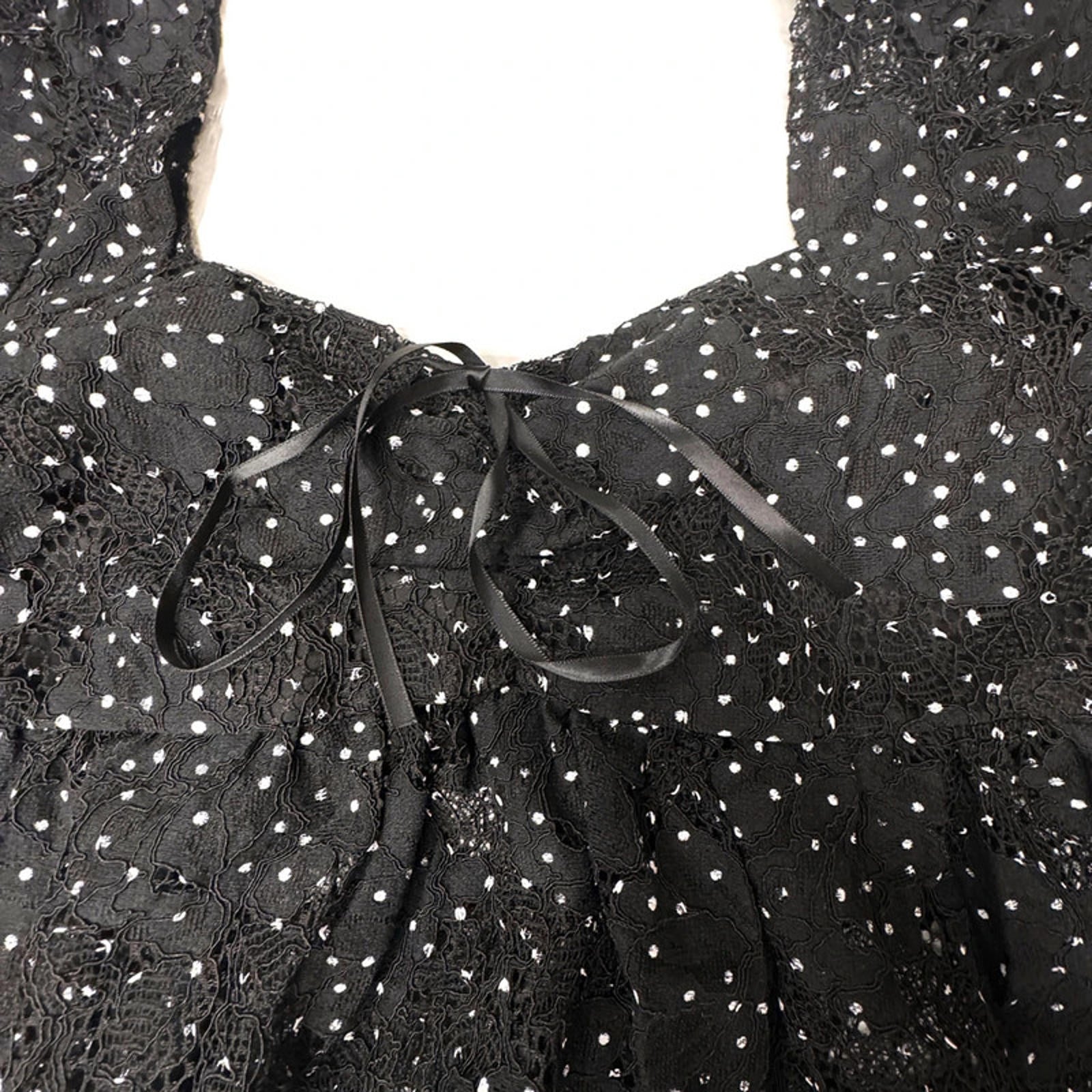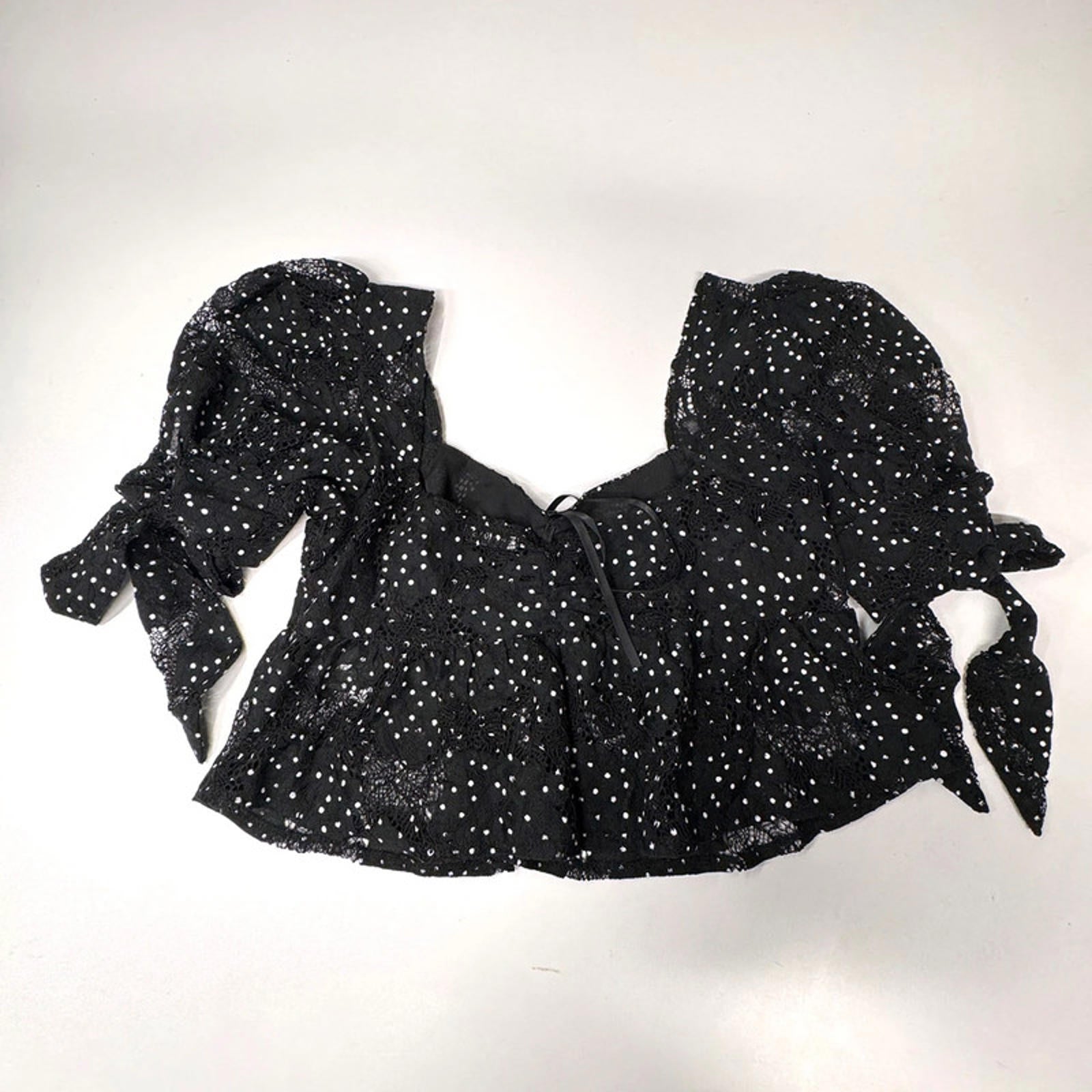 Rihoas black puff sleeve lace crop top with white polka dots and ribbon tie detail. Extra summery.