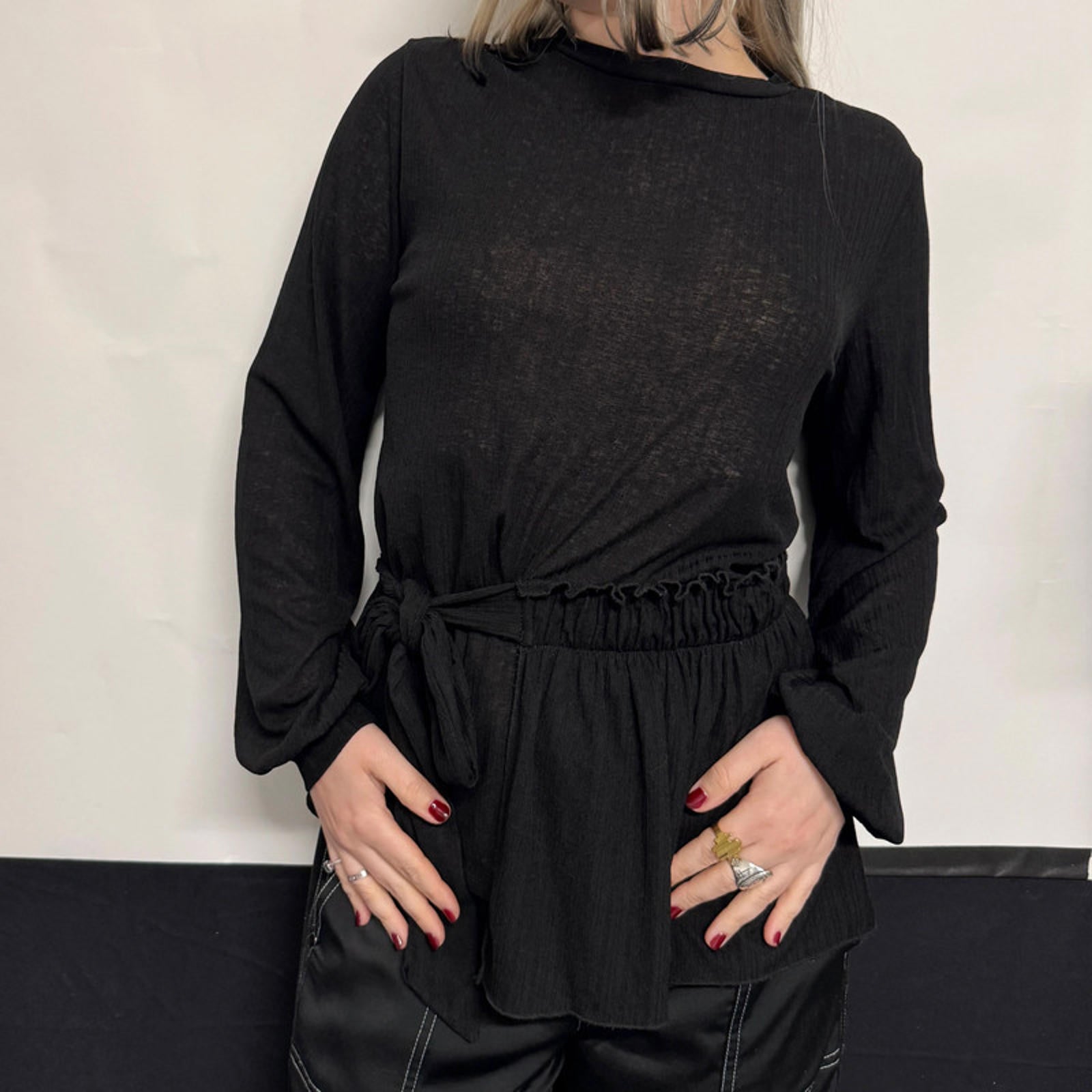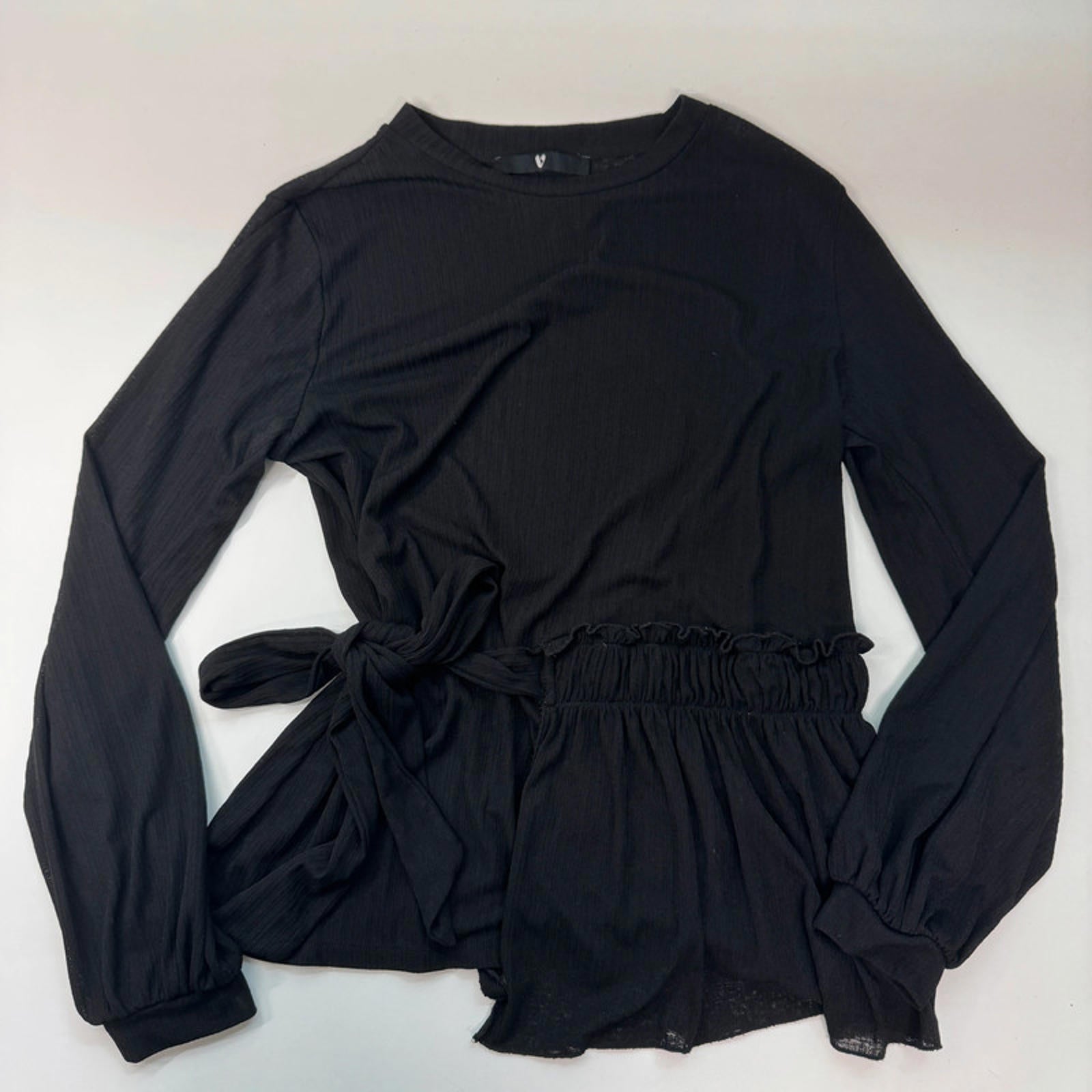 V by Very black sheer tie waist top. Long sleeves and a round neckline. Fabric is soft to the touch and super flattering on the body.