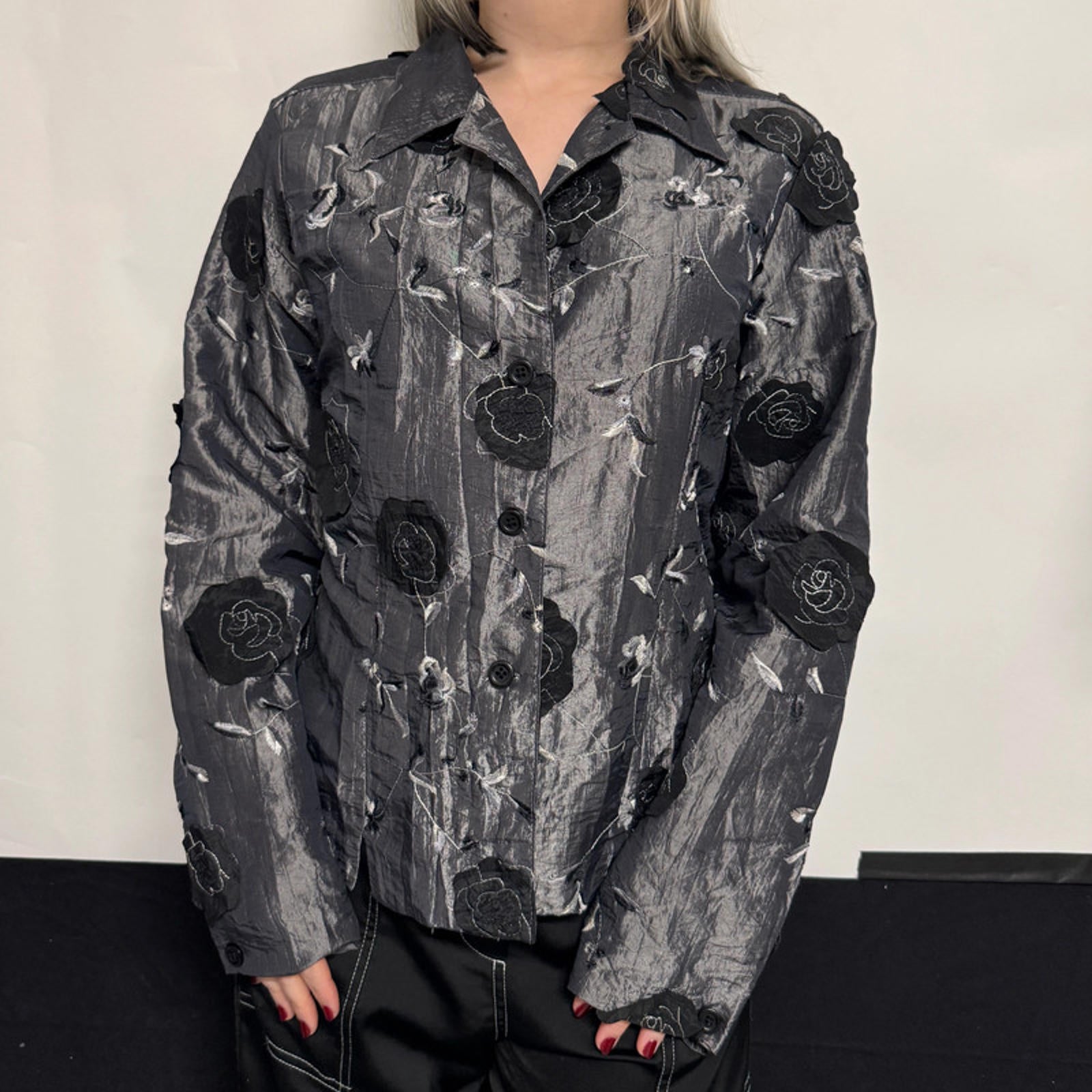 Vintage Ellen Margaret Moody vintage grey-silver satin long-sleeved jacket with rose textile embroidery. Button-up front with a little collar. Made in Canada. Obsessed with the colour, would be super great for adding texture and colour variation to an all-grey fit.