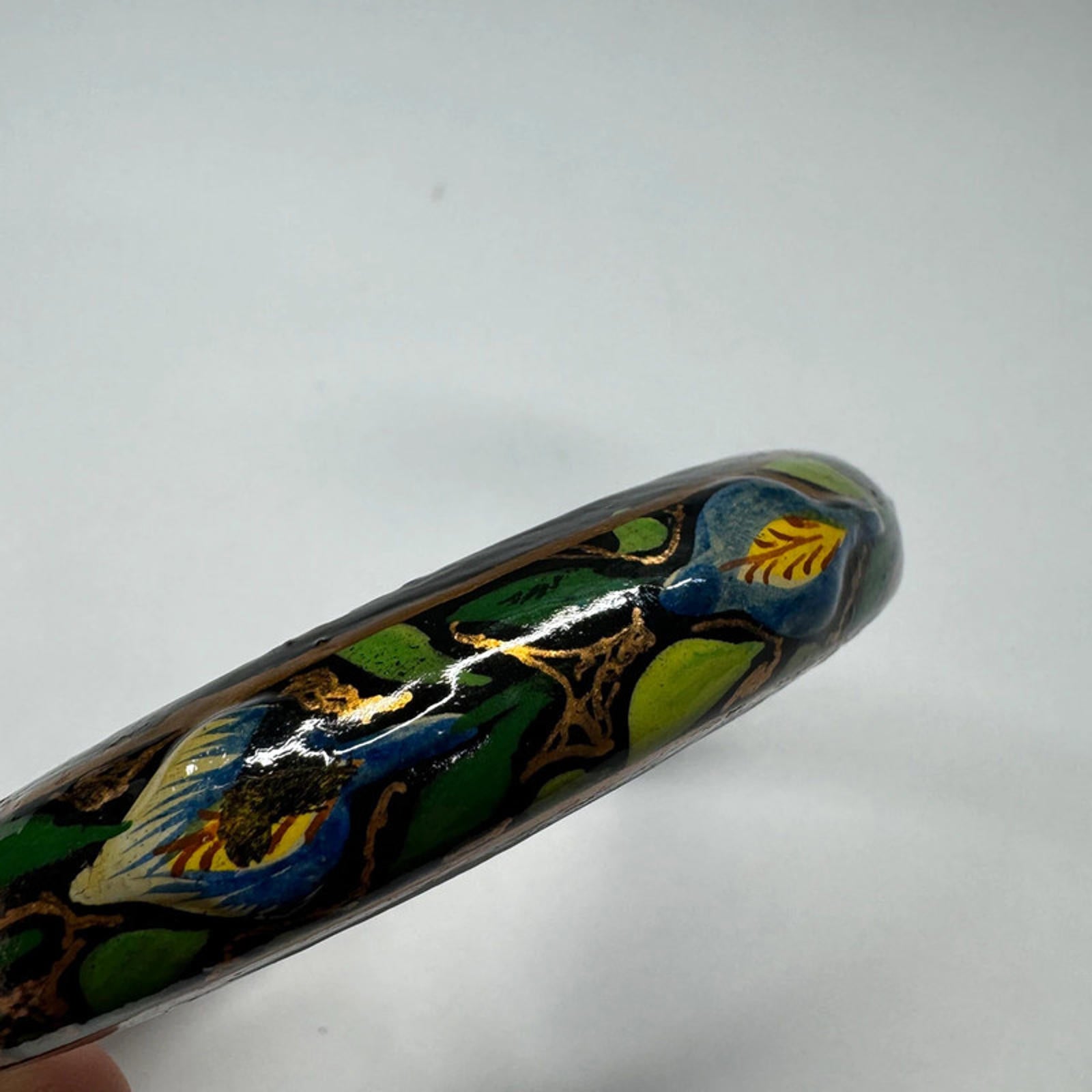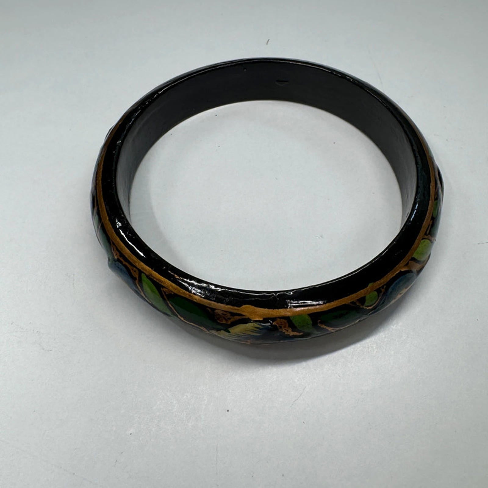 Vintage black lacquered wooden bangle with hand-painted blue florals and gold accents.